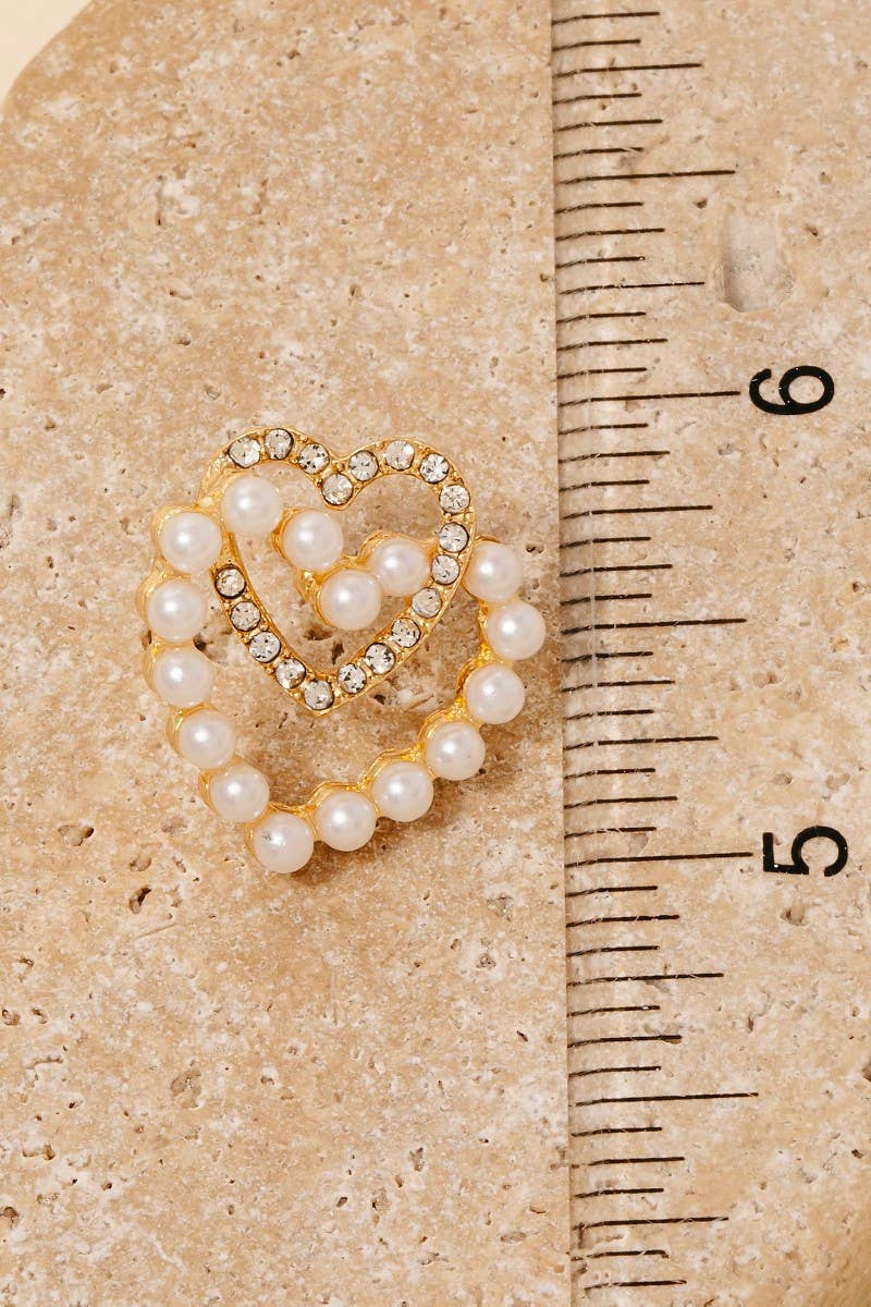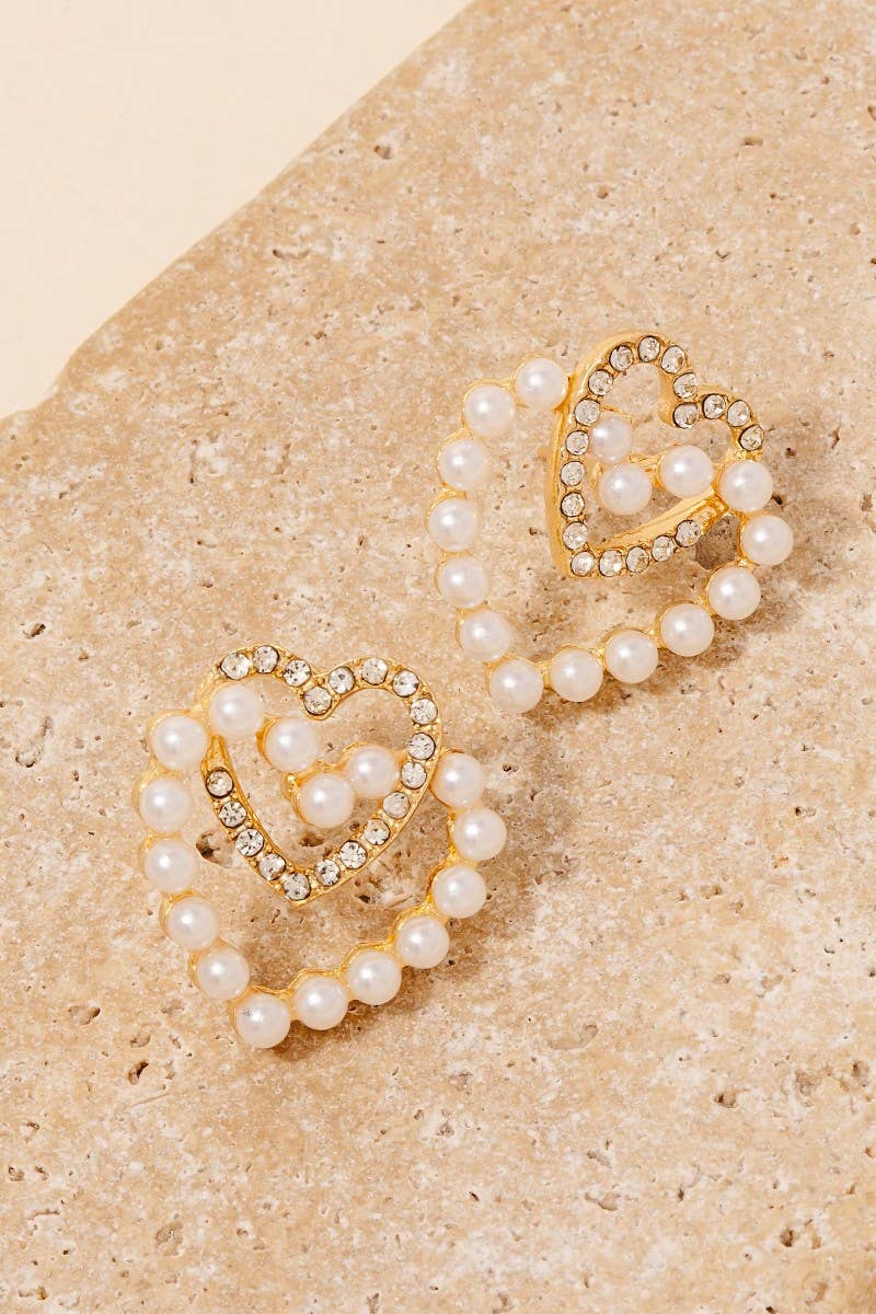 Pearl And Rhinestone Pave Layered Heart Dangle Earrings
