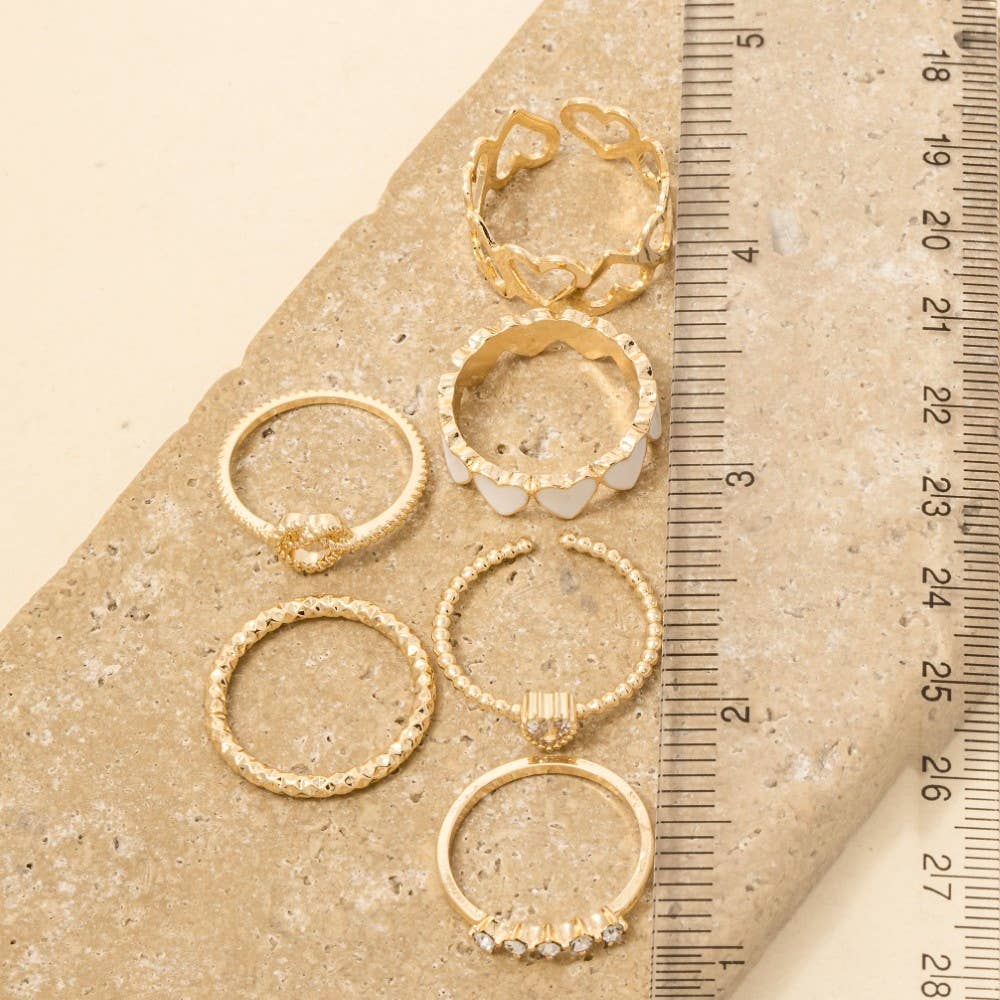 Effortlessly chic and sophisticated, this ring set features a distinct six piece heart rings set design. Elevate your fashion IQ with this versatile ring set, designed to seamlessly integrate into any style profile. This ring set is made with 70% Brass Zinc Steel And and 30% Glass Cubic Zirconia Epoxy.