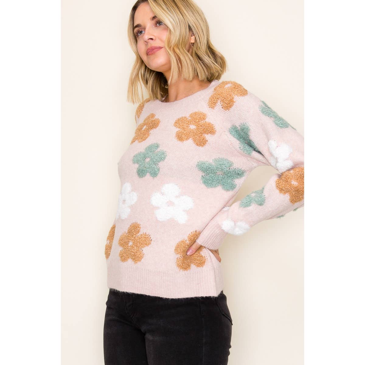 MULTI COLOR FLOWER JACQUARD, LONG SLEEVE, CREW NECK, PULLOVER SWEATER