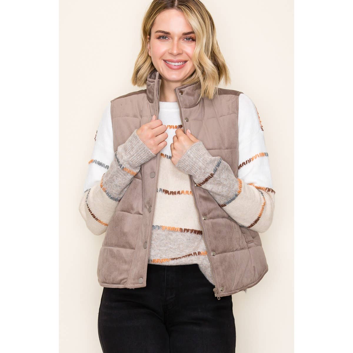 POLAR NECK, HIDDEN ZIP UP WITH SNAP BUTTON, MINI CORDUROY PUFFER VEST WITH POCKETS