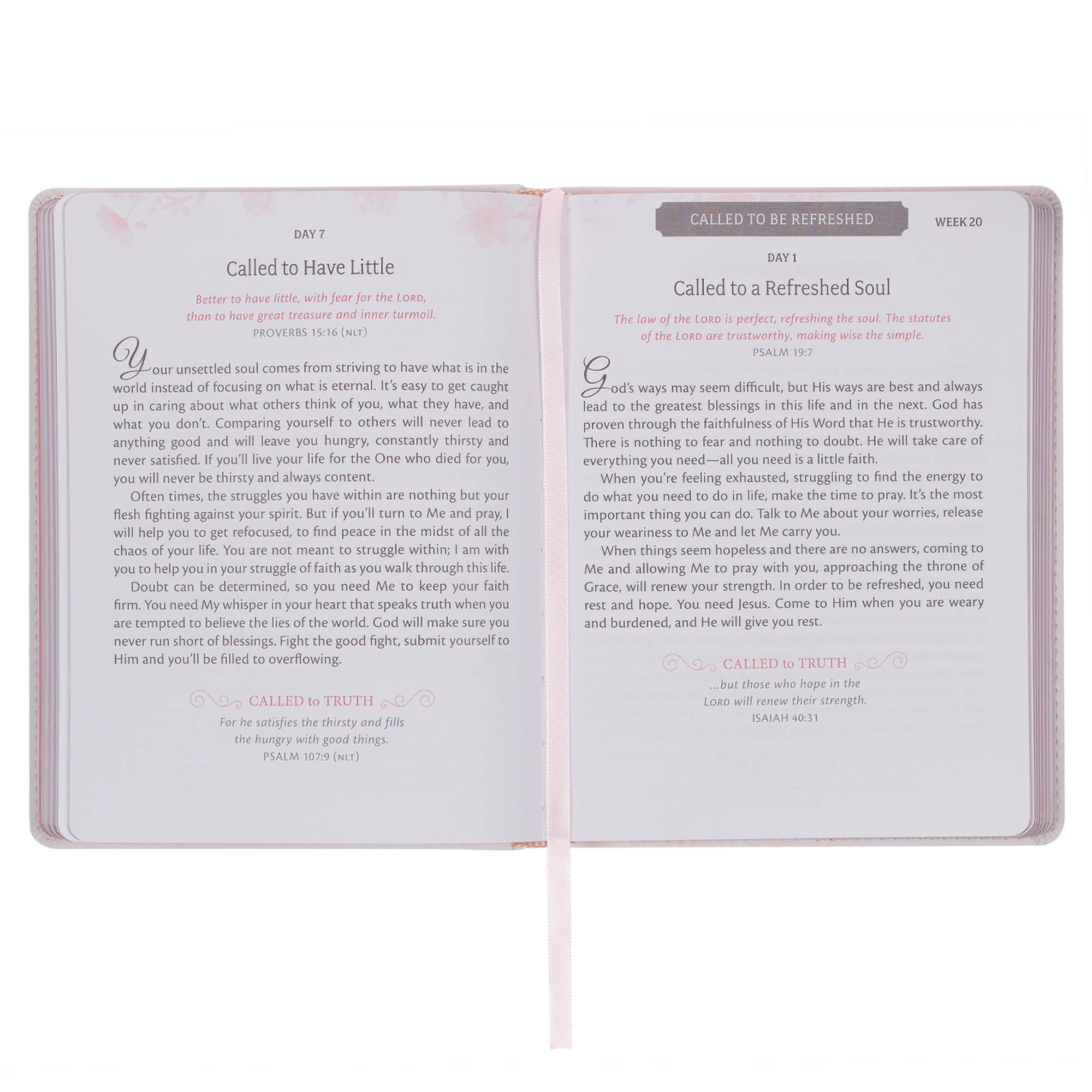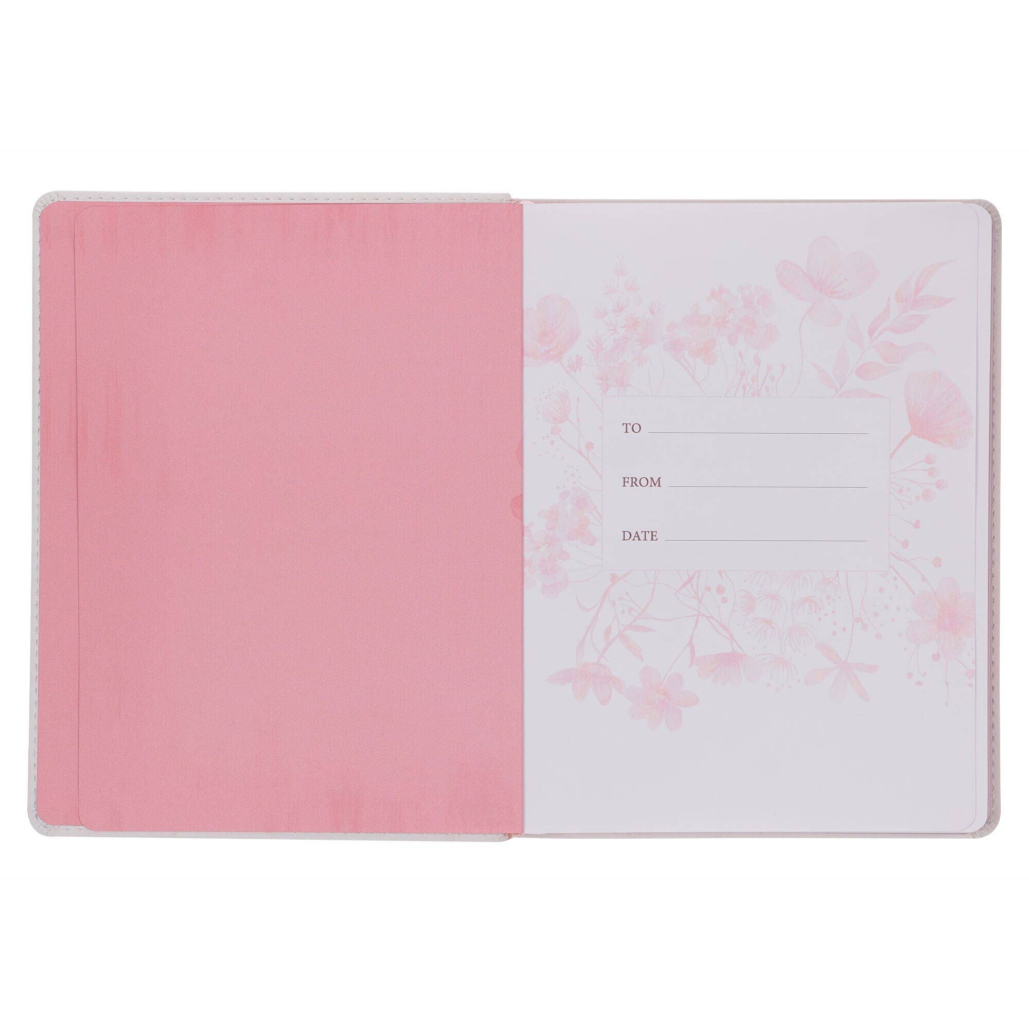 In a yearlong life-transforming journey, you'll find the Holy Spirit speaking directly to you through the daily readings in Walking in the Spirit Blush Pink Faux Leather Devotional.  Screen-printed orange and pink floral design, Blush pink faux leather, Pink screen-printed title, Gold foil accents, Flexcover, Two-color interior, Ribbon marker, 366 devotions, 372 pink gilt-edged pages, Size: 7.8" x 6" x 0.9" (198 x 152 x 23mm)